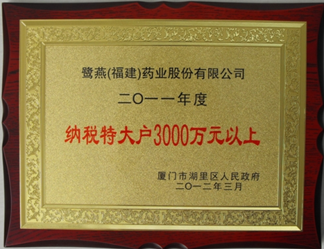 近日,廈門市湖里區隆重召開2011年度納稅先進企業表彰大會,鷺燕(福建)藥業股份有限公司以超3000萬的突出納稅貢獻榮獲“2011年度廈門湖里區納稅特大戶”稱號。